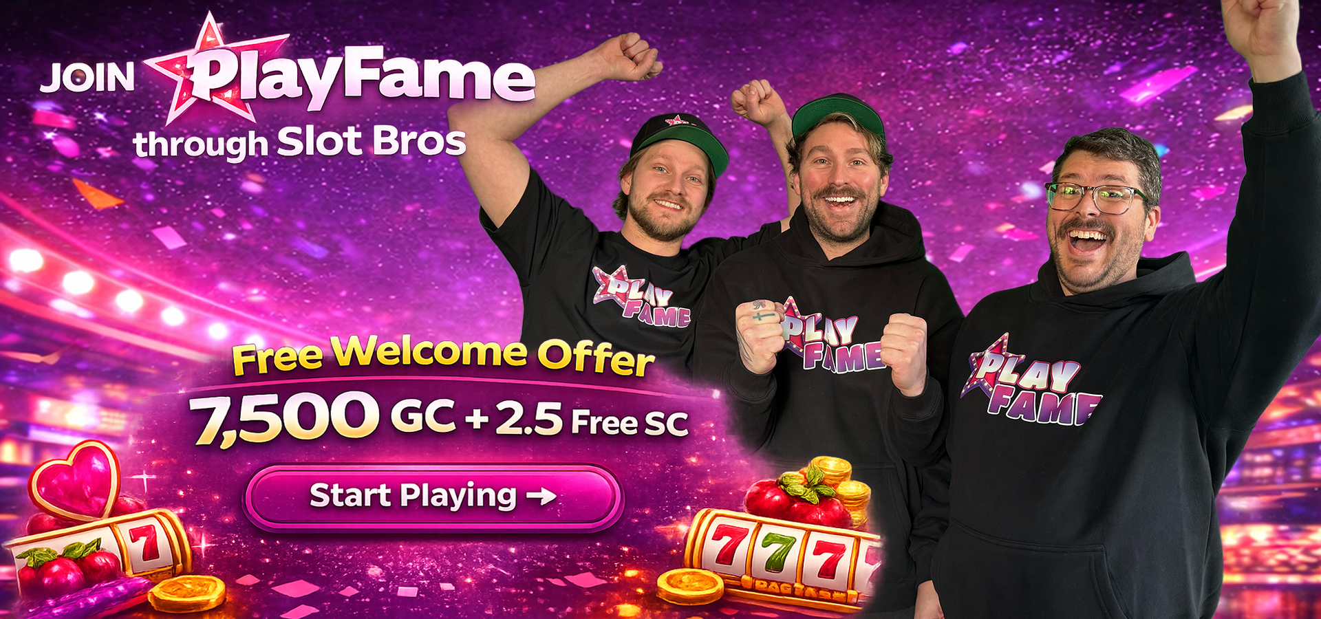Start with PlayFame through our Slot Bros partner page, check out the welcome offer, and continue straight to the site from here.